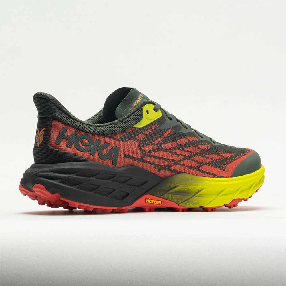 Grippy and cushioned, the HOKA Speedgoat 5 is a speedy trailblazer! This trail-ready workhorse features the same stack height and rocker design as its predecessor, now in a lighter and more durable package. Stay protected from trail hazards in the double jacquard mesh upper. The Vibram® Megagrip outsole provides reliable traction on any terrain. For runners and hikers who want to fly over rocky roads, the HOKA Speedgoat 5 prevails on any trail!