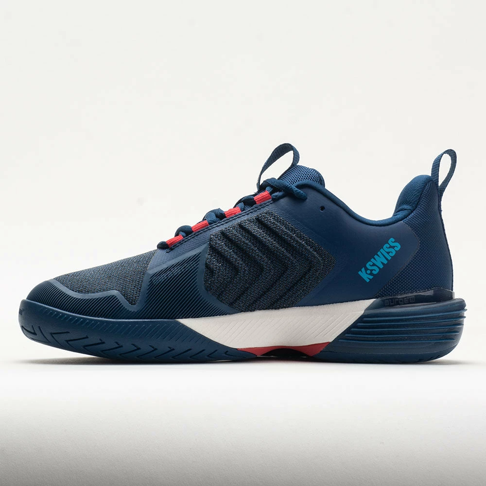 Built for the new wave of aggressive and powerful tennis players, the K-Swiss UltraShot 3 adds explosiveness to your game. With a DuraWrap material around the toe and DragGuard™ 7.0 technology in the heel, this tennis shoe protects you in high-wear areas. Move confidently in any direction with the 360 Plantar Support Chassis in the midsole. Stay energized during long matches on the lightweight Surge 7.0 midsole. Built for fierce rallies, the K-Swiss UltraShot 3 helps you compete at a high level!